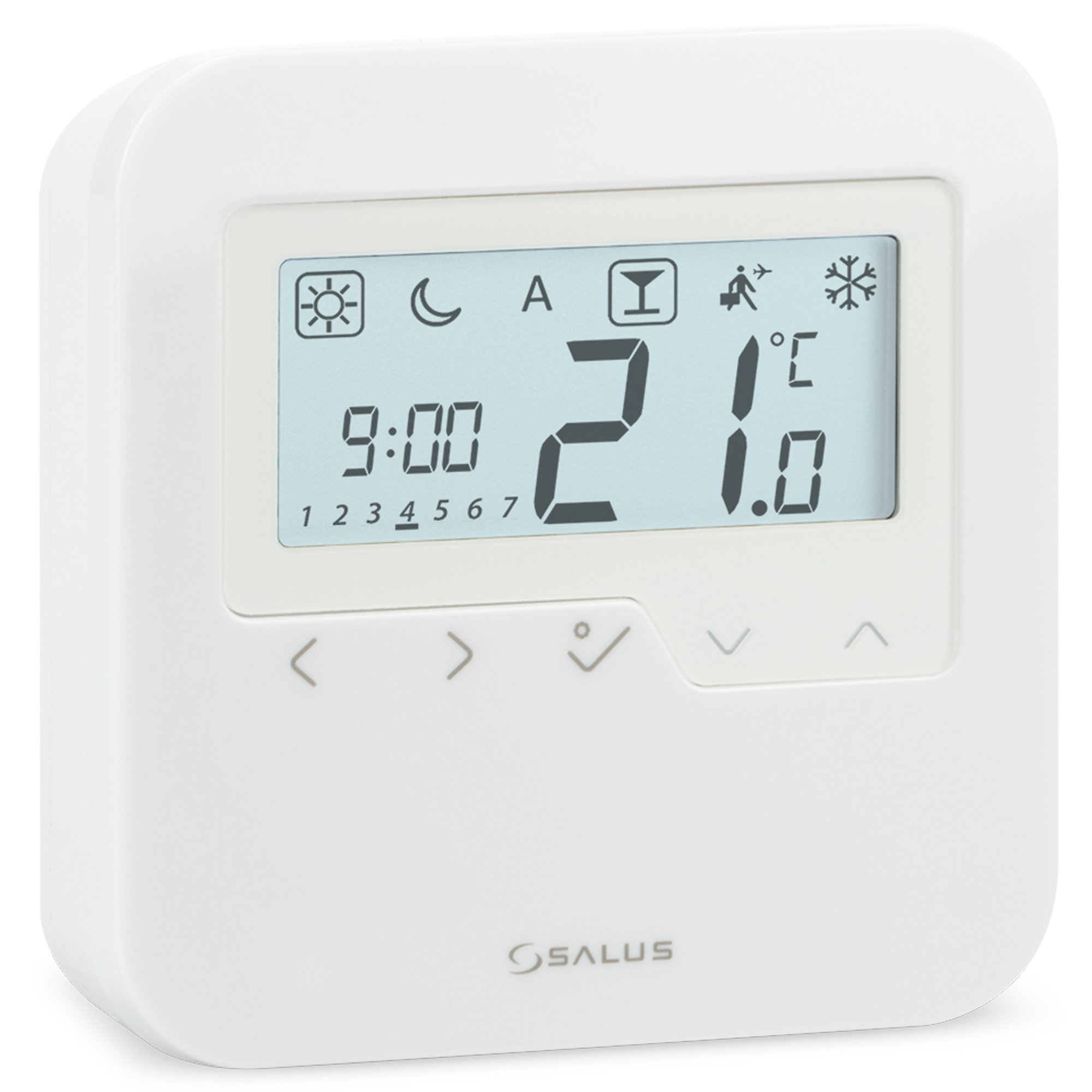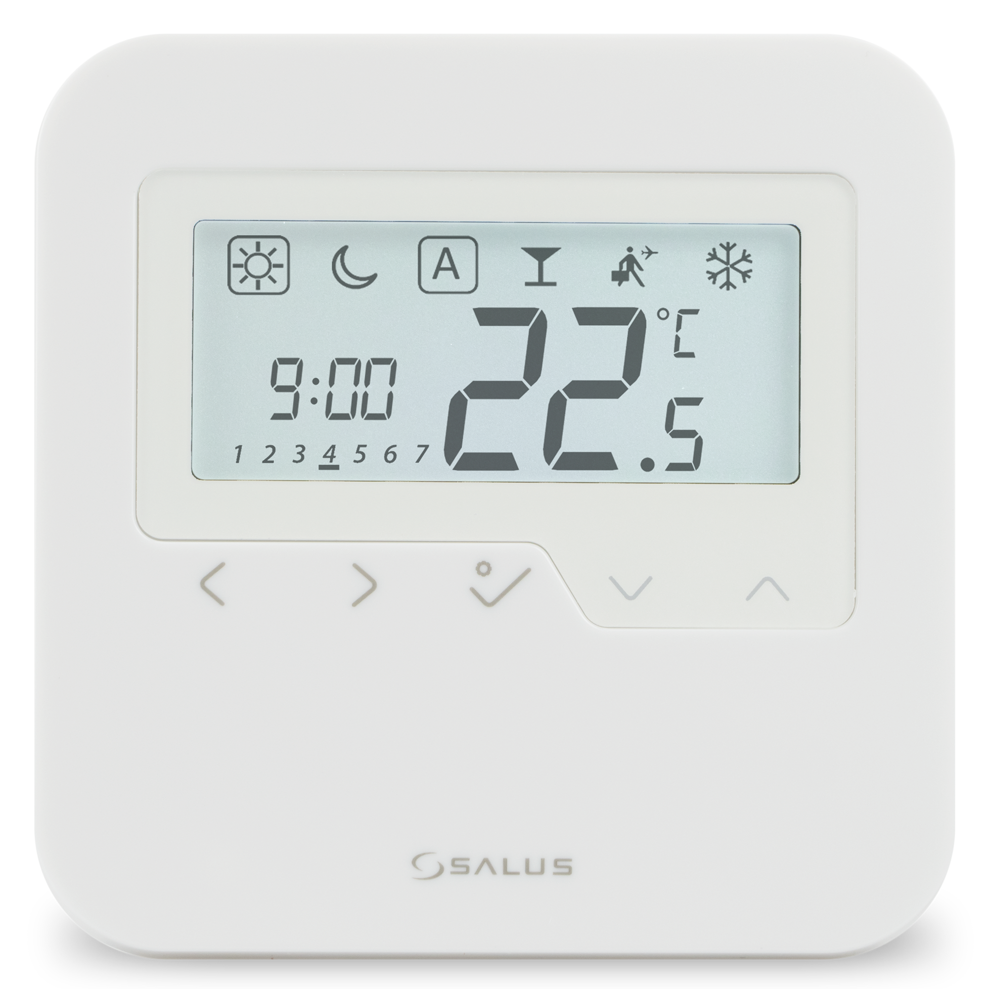 Nástenný izbový termostat SALUS HTRP24 je vhodný na reguláciu podlahového vykurovania/chladenia. Umožňuje značnú úsporu vďaka možnosti presnej kontroly požadovanej teploty a udržiavania stálej teploty v miestnosti s tepelnou zotrvačnosťou. Termostat musí byť pripojený k centrálnej svorkovnici, pomocou ktorej môže ovládať denné termostaty – signál NSB ich prepne na ekonomickú teplotu.