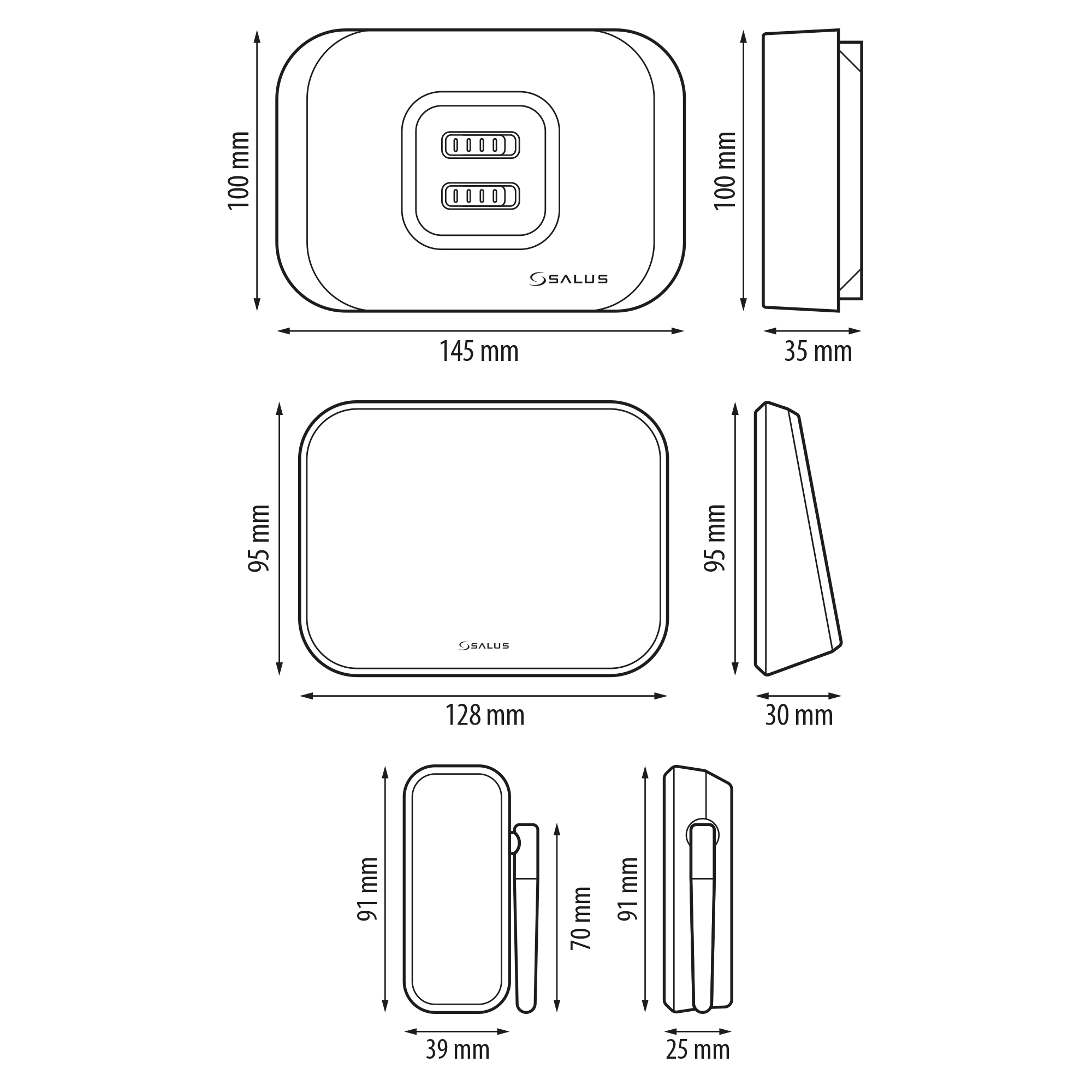| Rozmery | 128 x 95 x 30 mm (termostat) 145 x 65 x 35 mm (přijímač) 39 x 91 x 25 mm (internetová brána) |
