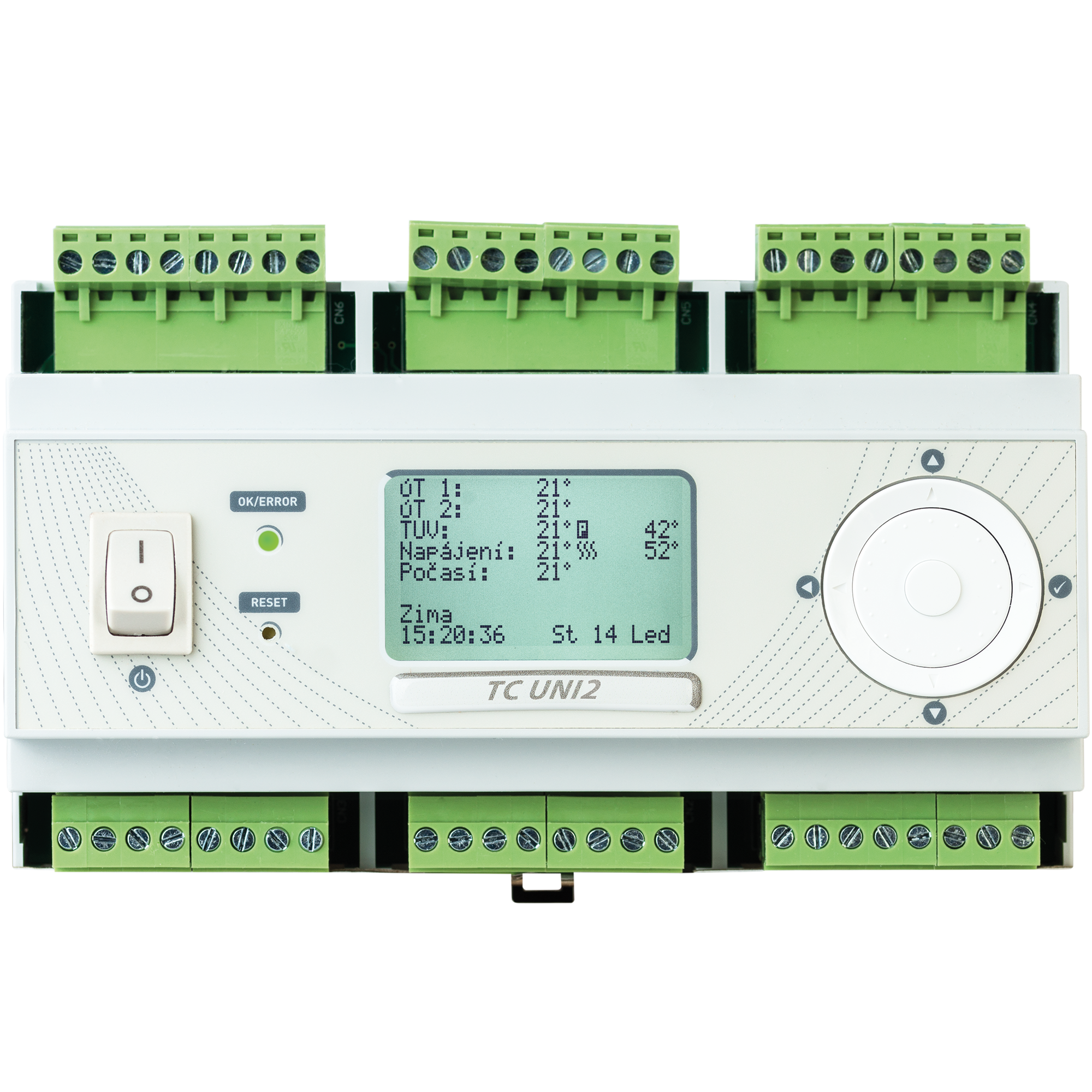 | Výstup | 230 V AC - čerpadla, ventily, alarm | Beznapěťový - přepínací kontakt zdroje tepla |