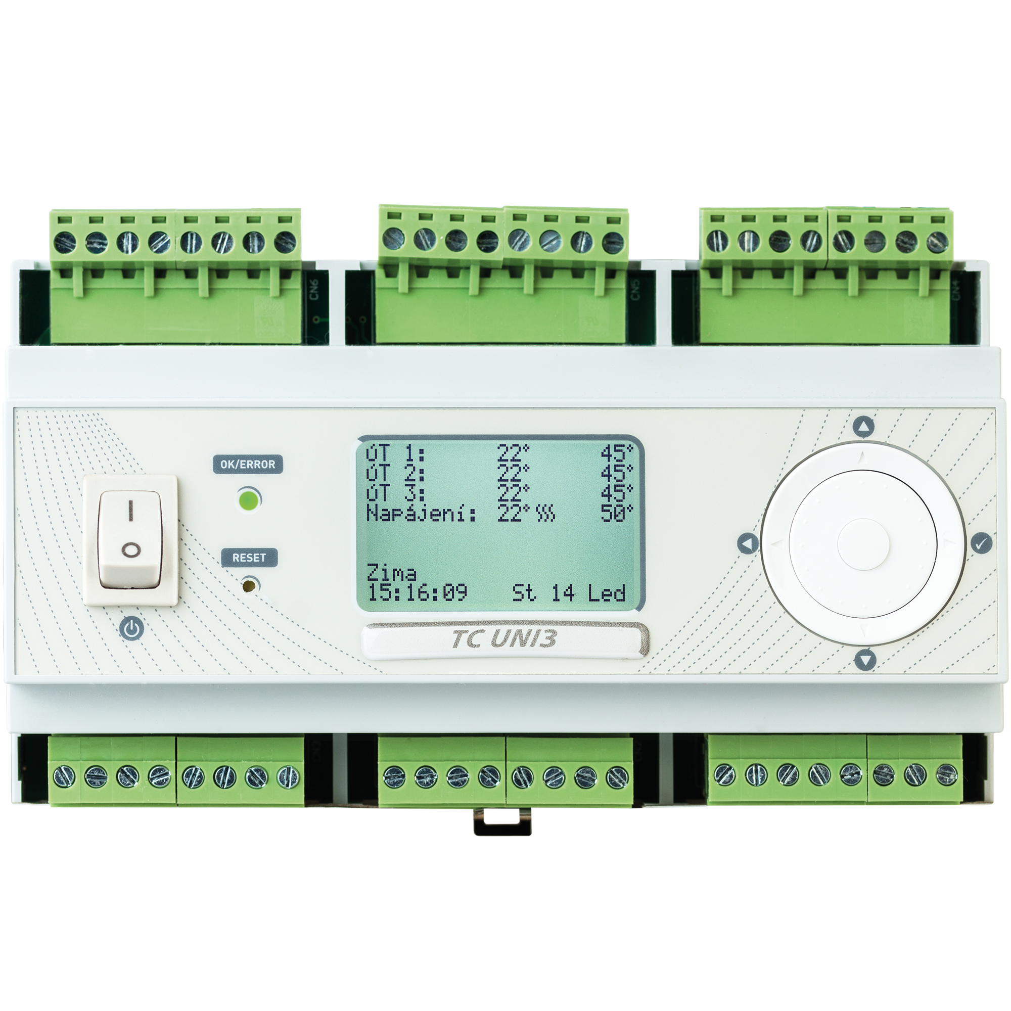 | Výstup | 230 V AC - čerpadla, ventily, alarm | Beznapěťový - přepínací kontakt zdroje tepla |